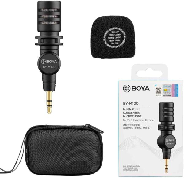 The body of the mic features a 3.5mm TRS male mini plug, which can be connected directly to the mini-jack input of your camera or audio recorder. This allows the BY-M100 to bypass the need for mounting accessories and audio cables. The mic head rotates up to 180 degrees for quick and optimal positioning. Affix the supplied foam windscreen to lessen noise from breezes and fans.